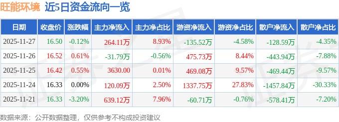 证券之星消息,截至2025年11月27日收盘,旺能环境(002034)报收于16.5元,下跌0.12%,换手率0.42%,成交量1.79万手,成交额2958.65万元。