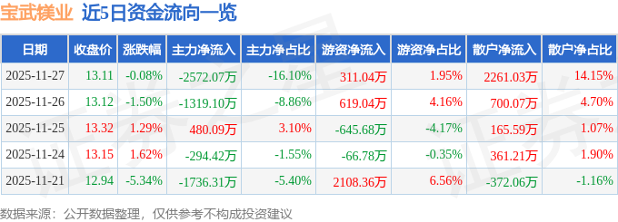 11月27日的资金流向数据方面,主力资金净流出2572.07万元,占总成交额16.1%,游资资金净流入311.04万元,占总成交额1.95%,散户资金净流入2261.03万元,占总成交额14.15%。