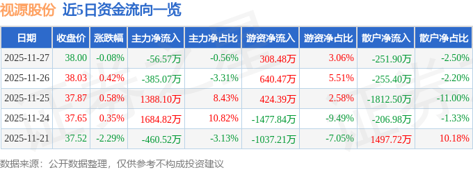 证券之星消息,截至2025年11月27日收盘,视源股份(002841)报收于38.0元,下跌0.08%,换手率0.51%,成交量2.64万手,成交额1.01亿元。