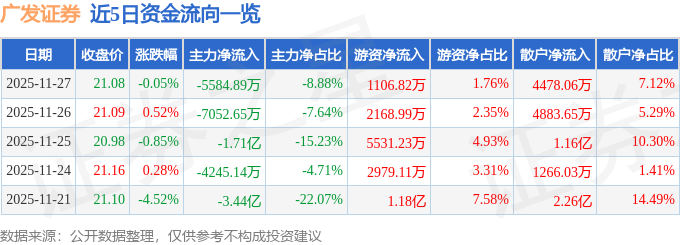 证券之星消息,截至2025年11月27日收盘,广发证券(000776)报收于21.08元,下跌0.05%,换手率0.5%,成交量29.68万手,成交额6.29亿元。
