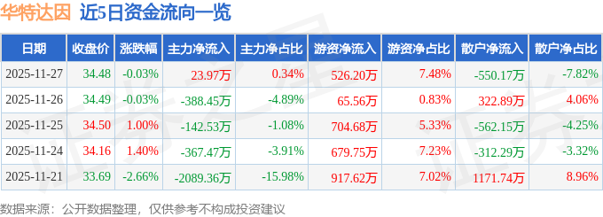 证券之星消息,截至2025年11月27日收盘,华特达因(000915)报收于34.48元,下跌0.03%,换手率0.87%,成交量2.04万手,成交额7037.78万元。