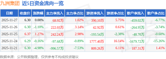 证券之星消息,截至2025年11月27日收盘,九洲集团(300040)报收于6.3元,上涨0.0%,换手率2.06%,成交量10.68万手,成交额6779.02万元。