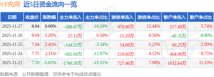 证券之星消息,截至2025年11月27日收盘,ST先河(300137)报收于8.04元,上涨0.0%,换手率0.89%,成交量4.7万手,成交额3787.41万元。