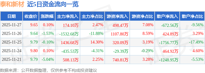 证券之星消息,截至2025年11月27日收盘,泰和新材(002254)报收于9.65元,上涨0.1%,换手率0.89%,成交量7.28万手,成交额7037.36万元。
