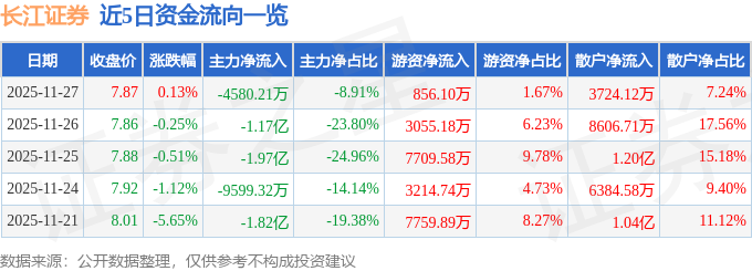 证券之星消息,截至2025年11月27日收盘,长江证券(000783)报收于7.87元,上涨0.13%,换手率1.17%,成交量64.97万手,成交额5.14亿元。