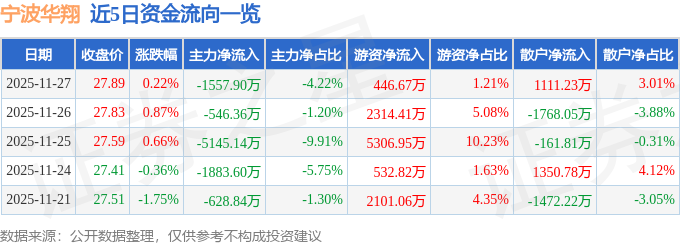 证券之星消息,截至2025年11月27日收盘,宁波华翔(002048)报收于27.89元,上涨0.22%,换手率1.85%,成交量13.15万手,成交额3.69亿元。