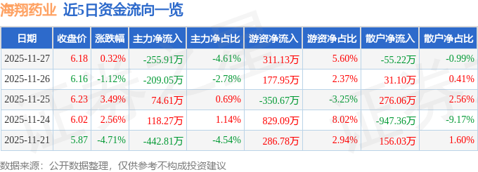 证券之星消息,截至2025年11月27日收盘,海翔药业(002099)报收于6.18元,上涨0.32%,换手率0.56%,成交量8.99万手,成交额5556.29万元。