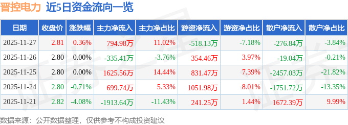 证券之星消息,截至2025年11月27日收盘,晋控电力(000767)报收于2.81元,上涨0.36%,换手率0.88%,成交量25.64万手,成交额7215.1万元。