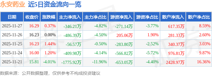 证券之星消息,截至2025年11月27日收盘,永安药业(002365)报收于16.29元,上涨0.37%,换手率1.8%,成交量4.42万手,成交额7187.32万元。
