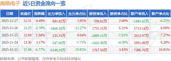 证券之星消息,截至2025年11月27日收盘,商络电子(300975)报收于12.31元,上涨0.49%,换手率3.78%,成交量18.59万手,成交额2.31亿元。