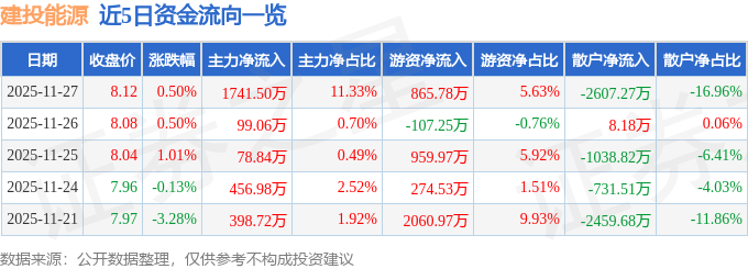 证券之星消息,截至2025年11月27日收盘,建投能源(000600)报收于8.12元,上涨0.5%,换手率1.73%,成交量18.84万手,成交额1.54亿元。