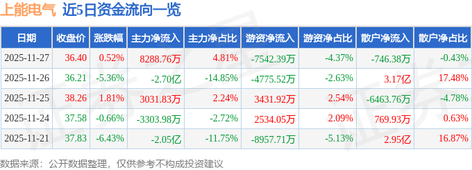 证券之星消息,截至2025年11月27日收盘,上能电气(300827)报收于36.4元,上涨0.52%,换手率12.09%,成交量46.58万手,成交额17.25亿元。