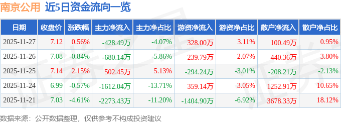 证券之星消息,截至2025年11月27日收盘,南京公用(000421)报收于7.12元,上涨0.56%,换手率2.58%,成交量14.81万手,成交额1.05亿元。