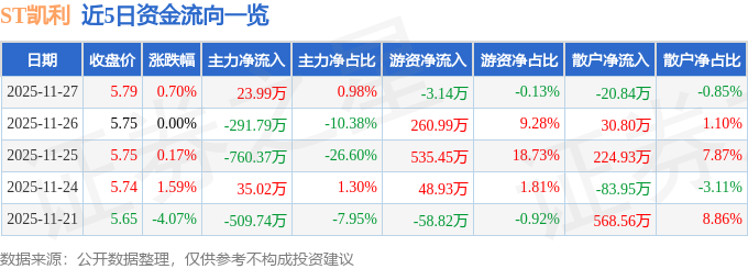 证券之星消息,截至2025年11月27日收盘,ST凯利(300326)报收于5.79元,上涨0.7%,换手率0.6%,成交量4.25万手,成交额2443.43万元。