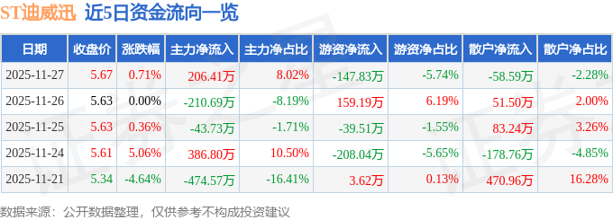证券之星消息,截至2025年11月27日收盘,ST迪威迅(300167)报收于5.67元,上涨0.71%,换手率1.27%,成交量4.54万手,成交额2574.76万元。