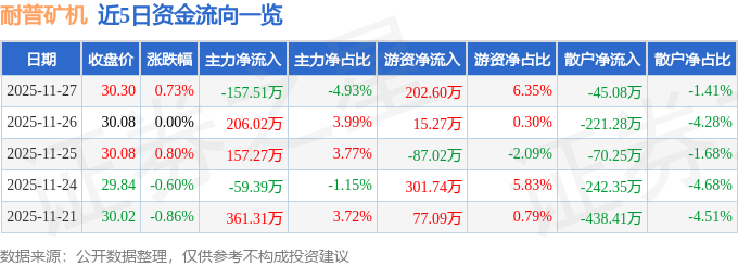 证券之星消息,截至2025年11月27日收盘,耐普矿机(300818)报收于30.3元,上涨0.73%,换手率0.96%,成交量1.05万手,成交额3192.18万元。