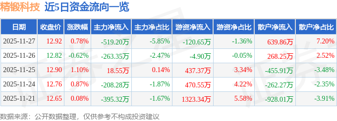 证券之星消息,截至2025年11月27日收盘,精锻科技(300258)报收于12.92元,上涨0.78%,换手率1.21%,成交量6.88万手,成交额8882.37万元。