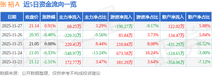 11月27日的资金流向数据方面,主力资金净流入68.25万元,占总成交额3.29%,游资资金净流出190.27万元,占总成交额9.17%,散户资金净流入122.02万元,占总成交额5.88%。