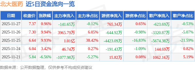 证券之星消息,截至2025年11月27日收盘,北大医药(000788)报收于7.37元,上涨0.96%,换手率27.99%,成交量166.81万手,成交额11.79亿元。