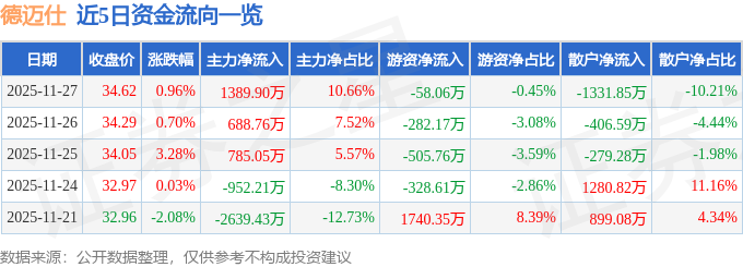 证券之星消息,截至2025年11月27日收盘,德迈仕(301007)报收于34.62元,上涨0.96%,换手率2.43%,成交量3.71万手,成交额1.3亿元。