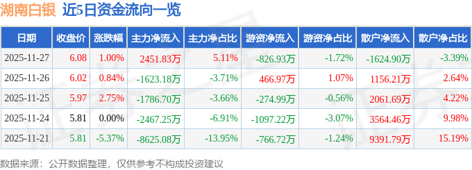 证券之星消息,截至2025年11月27日收盘,湖南白银(002716)报收于6.08元,上涨1.0%,换手率3.38%,成交量78.66万手,成交额4.79亿元。