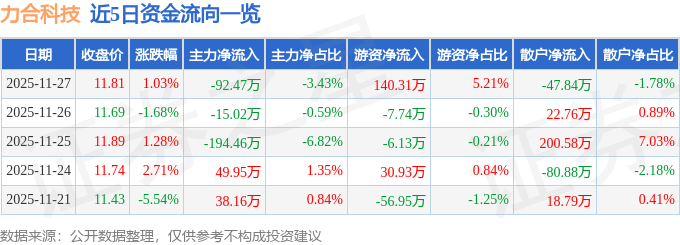 证券之星消息,截至2025年11月27日收盘,力合科技(300800)报收于11.81元,上涨1.03%,换手率0.98%,成交量2.29万手,成交额2693.14万元。