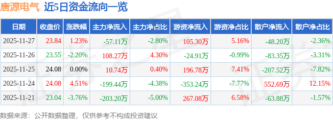 证券之星消息,截至2025年11月27日收盘,唐源电气(300789)报收于23.84元,上涨1.23%,换手率0.87%,成交量8556.0手,成交额2042.35万元。