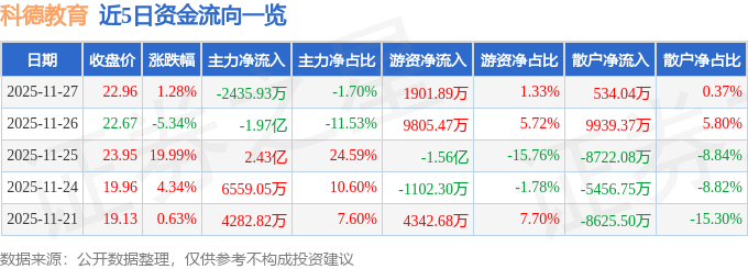 证券之星消息,截至2025年11月27日收盘,科德教育(300192)报收于22.96元,上涨1.28%,换手率19.26%,成交量62.53万手,成交额14.35亿元。