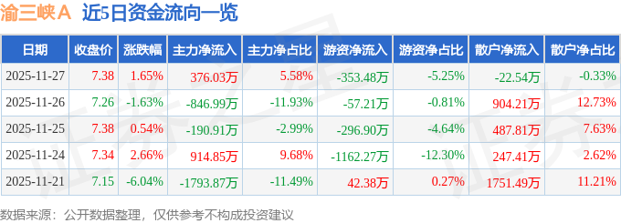 证券之星消息,截至2025年11月27日收盘,渝三峡A(000565)报收于7.38元,上涨1.65%,换手率2.11%,成交量9.16万手,成交额6738.58万元。