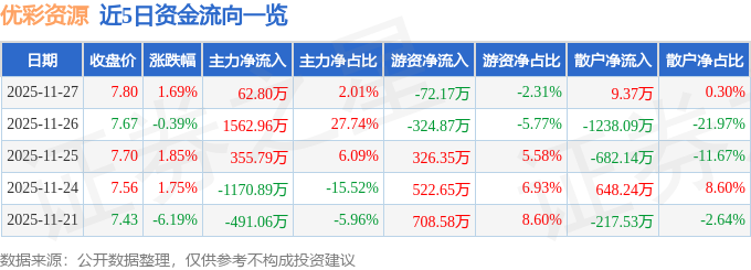证券之星消息,截至2025年11月27日收盘,优彩资源(002998)报收于7.8元,上涨1.69%,换手率1.5%,成交量4.03万手,成交额3123.67万元。