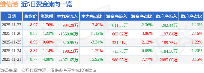 证券之星消息,截至2025年11月27日收盘,维信诺(002387)报收于8.97元,上涨1.7%,换手率2.06%,成交量28.76万手,成交额2.59亿元。