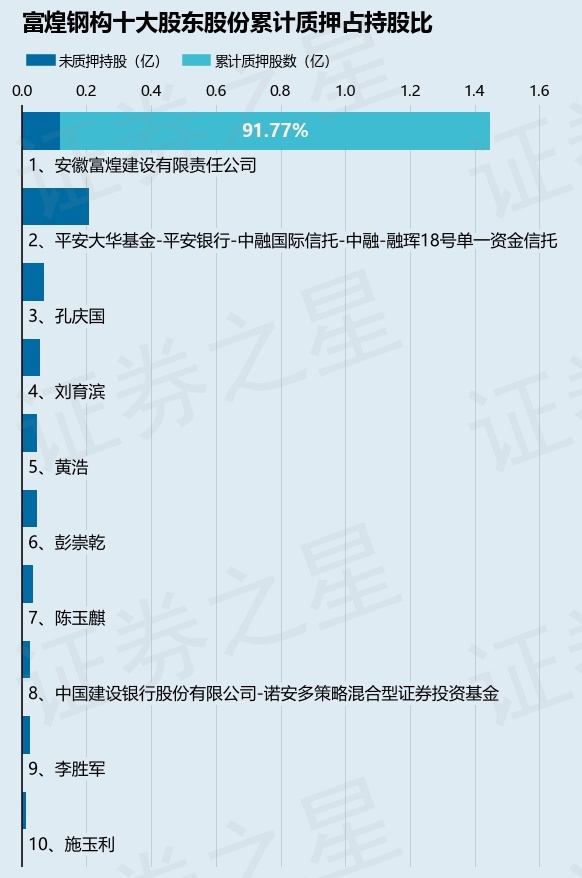 截止本公告日,股东安徽富煌建设有限责任公司已累计质押股份1.33亿股,占其持股总数的91.77%。本次质押后富煌钢构十大股东的累计质押股份占持股比例(占持股比例的计算以公司最新一期财务报表公布的十大股东的持股总数为基准)见下图: