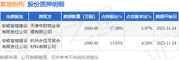 证券之星消息,富煌钢构(002743)11月28日公开信息显示,股东安徽富煌建设有限责任公司向天津中财商业保理有限公司、杭州永佳灵复合材料有限公司合计质押4600.0万股,占总股本10.56%。质押详情见下表: