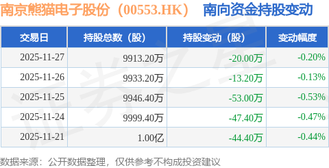证券之星消息,11月27日南向资金减持20.0万股南京熊猫电子股份(00553.HK)。近5个交易日中,获南向资金减持的有5天,累计净减持178.0万股。近20个交易日中,获南向资金减持的有10天,累计净减持111.2万股。截至目前,南向资金持有南京熊猫电子股份(00553.HK)9913.2万股,占公司已发行普通股的40.95%。