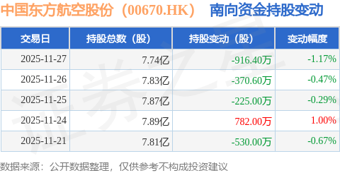 证券之星消息,11月27日南向资金减持916.4万股中国东方航空股份(00670.HK)。近5个交易日中,获南向资金减持的有4天,累计净减持1260.0万股。近20个交易日中,获南向资金增持的有12天,累计净增持3299.59万股。截至目前,南向资金持有中国东方航空股份(00670.HK)7.74亿股,占公司已发行普通股的15.28%。