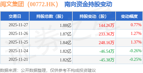 证券之星消息,11月27日南向资金增持144.26万股阅文集团(00772.HK)。近5个交易日中,获南向资金增持的有3天,累计净增持533.86万股。近20个交易日中,获南向资金增持的有9天,累计净增持164.55万股。截至目前,南向资金持有阅文集团(00772.HK)1.88亿股,占公司已发行普通股的18.39%。