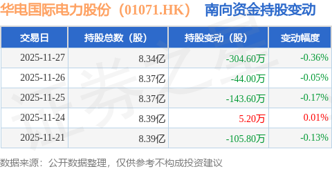 证券之星消息,11月27日南向资金减持304.6万股华电国际电力股份(01071.HK)。近5个交易日中,获南向资金减持的有4天,累计净减持592.8万股。近20个交易日中,获南向资金减持的有15天,累计净减持6488.64万股。截至目前,南向资金持有华电国际电力股份(01071.HK)8.34亿股,占公司已发行普通股的48.54%。