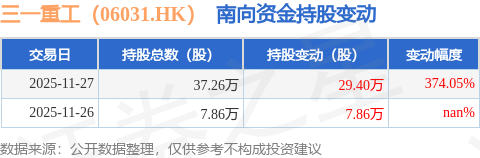 证券之星消息,11月27日南向资金增持29.4万股三一重工(06031.HK)。截至目前,南向资金持有三一重工(06031.HK)37.26万股,占公司已发行普通股的0.04%。