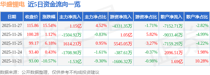 证券之星消息,截至2025年11月27日收盘,华盛锂电(688353)报收于115.86元,上涨15.54%,换手率20.09%,成交量23.92万手,成交额25.4亿元。
