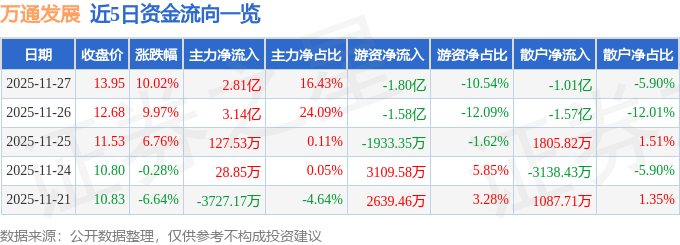 证券之星消息,截至2025年11月27日收盘,万通发展(600246)报收于13.95元,上涨10.02%,已连续涨停2天,换手率6.55%,成交量123.81万手,成交额17.08亿元。