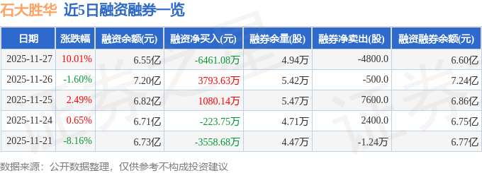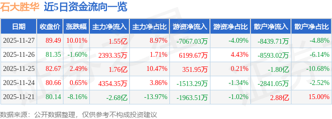 证券之星消息,截至2025年11月27日收盘,石大胜华(603026)报收于89.49元,上涨10.01%,涨停,换手率9.86%,成交量19.99万手,成交额17.28亿元。