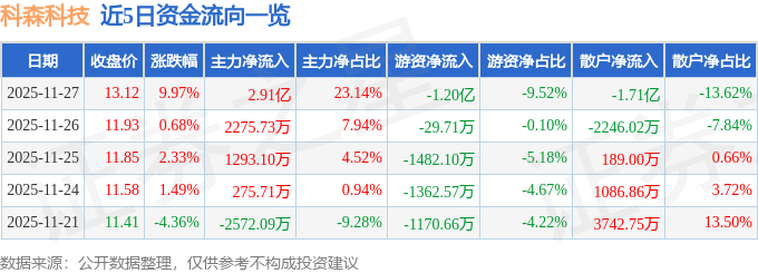 证券之星消息,截至2025年11月27日收盘,科森科技(603626)报收于13.12元,上涨9.97%,涨停,换手率17.65%,成交量97.92万手,成交额12.57亿元。