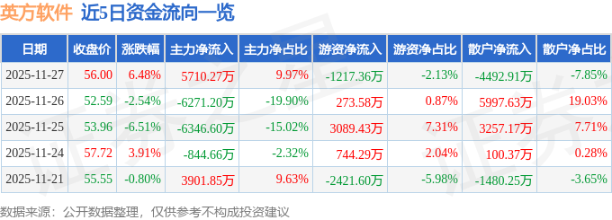 证券之星消息,截至2025年11月27日收盘,英方软件(688435)报收于56.0元,上涨6.48%,换手率20.8%,成交量9.82万手,成交额5.73亿元。