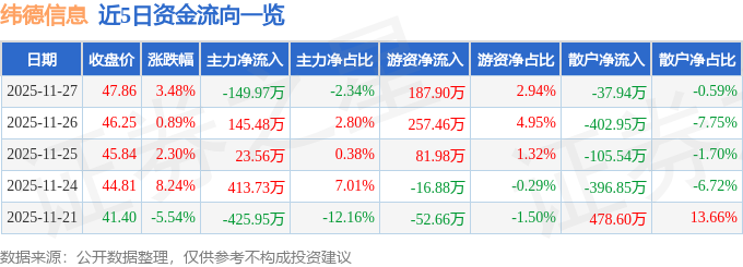 证券之星消息,截至2025年11月27日收盘,纬德信息(688171)报收于47.86元,上涨3.48%,换手率1.61%,成交量1.35万手,成交额6399.93万元。
