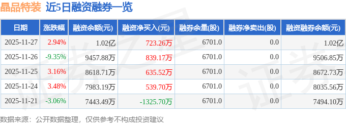 晶品特装融资融券信息显示,融资方面,当日融资买入4178.87万元,融资偿还3455.61万元,融资净买入723.26万元,连续3日净买入累计2197.95万元。融券方面,融券卖出0.0股,融券偿还0.0股,融券余量6701.0股,融券余额50.41万元。融资融券余额1.02亿元。