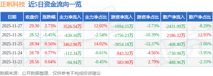 11月27日的资金流向数据方面,主力资金净流入3526.54万元,占总成交额12.02%,游资资金净流出1094.55万元,占总成交额3.73%,散户资金净流出2431.99万元,占总成交额8.29%。