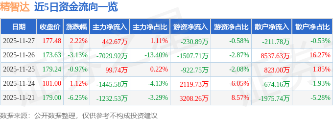 证券之星消息,截至2025年11月27日收盘,精智达(688627)报收于177.48元,上涨2.22%,换手率3.05%,成交量2.21万手,成交额3.98亿元。