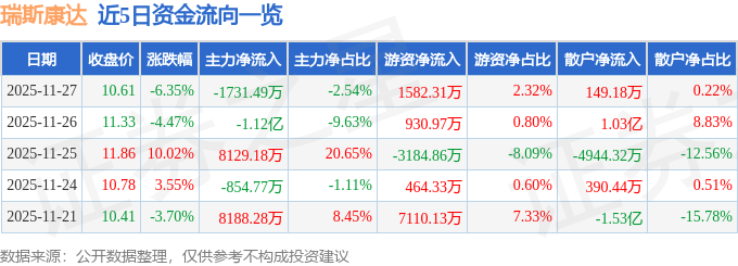 证券之星消息,截至2025年11月27日收盘,瑞斯康达(603803)报收于10.61元,下跌6.35%,换手率15.0%,成交量63.72万手,成交额6.82亿元。