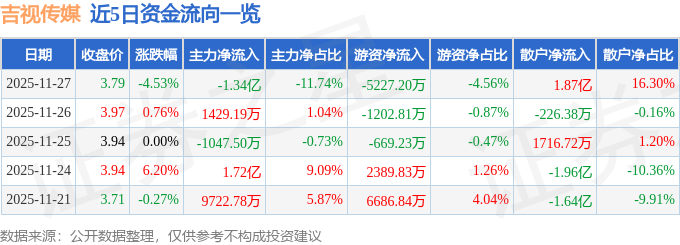 证券之星消息,截至2025年11月27日收盘,吉视传媒(601929)报收于3.79元,下跌4.53%,换手率8.56%,成交量298.77万手,成交额11.46亿元。