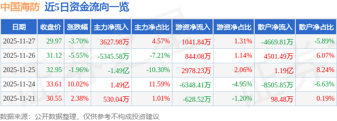 证券之星消息,截至2025年11月27日收盘,中国海防(600764)报收于29.97元,下跌3.7%,换手率3.68%,成交量26.16万手,成交额7.93亿元。